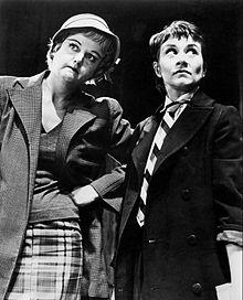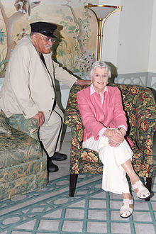 In April 1957 she debuted on Broadway at the Henry Miller Theatre in Hotel Paradiso, a French burlesque set in Paris, directed by Peter Glenville. The play only ran for 15 weeks, although she earned good reviews for her role as "Marcel Cat". She later stated that had she not appeared in the play, her "whole career would have fizzled out."[55] She followed this with an appearance in 1960s Broadway performance of A Taste of Honey at the Lyceum Theatre, directed by Tony Richardson and George Devine. Lansbury played Helen, the boorish, verbally abusive, otherwise absentee mother of Josephine (played by Joan Plowright, only four years Lansbury's junior), remarking that she gained "a great deal of satisfaction" from the role.[56] During the show's run, Lansbury developed a friendship with Plowright, as well as with Plowright's lover and future husband, Laurence Olivier. It was from Lansbury's rented flat on East 97th Street that Plowright and Olivier eloped to be married.[57] After a well-reviewed appearance in Summer of the Seventeenth Doll (1959) – for which she had filmed in Sydney, Australia – and a minor role in A Breath of Scandal (1960), she appeared in 1961's Blue Hawaii as an overbearing mother, whose son was played by Elvis Presley.[58] Acknowledging that the film was of poor quality, she commented that she agreed to appear in it because "I was desperate."[59]