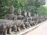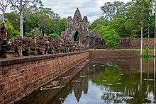Angkor Thom is in the Bayon style.[6] This manifests itself in the large scale of the construction, in the widespread use of laterite,[7] in the face-towers at each of the entrances to the city and in the naga-carrying giant figures which accompany each of the towers.