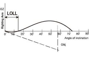 At some angle of heel (say 10°), KM will increase sufficiently equal to KG (distance from the keel to the centre of gravity), thus making GM of vessel equal to zero. When this occurs, the vessel goes to neutral equilibrium, and the angle of heel at which it happens is called angle of loll. In other words, when an unstable vessel heels over towards a progressively increasing angle of heel, at a certain angle of heel, the centre of buoyancy (B) may fall vertically below the centre of gravity (G). Angle of list should not be confused with angle of loll. Angle of list is caused by unequal loading on either side of centre line of vessel.