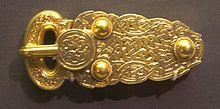 Prosperity was marked by ownership of gold: buckles, brooches and gold embroidery or brocading on garments. Ornate buckles and clasps identified the wearer as important men of the seventh century. The jacket appeared during this time as well. For those who could afford it, the jacket was made of fur while less costly ones were made of linen.[72] Pile woven cloaks, which probably imitated fur in their shaggy effect, were a high status alternative for men in the seventh century.[73] The extremely affluent male buried AD 625 in the Sutton Hoo Ship Burial (mound 1) was supplied with two pairs of shoes, several yellow-dyed cloaks, and possible alternative sets of jewelled belt equipment.[23][74]