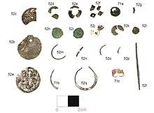 Jewellery was found in very few male graves of this period. Some beads have been uncovered in some male burial sites and may have been decorated a belt or weapon. Anglo-Saxon literary evidence from this time period suggest that men frequently wore rings, but there have been very few rings discovered in Anglo-Saxon male graves.[42]