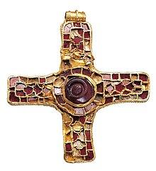 Along with the spread of Christianity in seventh century England, religious art and European fashion inspired changes in women's dress.[14] These changes were marked by the disappearance of the paired brooch, aside from very small annular and penannular brooches; occasional elaborate, round brooches were also worn individually. Linked pins appeared during the seventh century. There were fewer bead ornaments than before, and amber largely disappeared during this time period.[23]