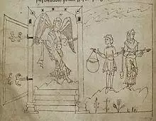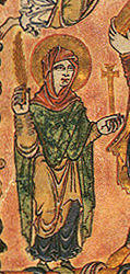 Women wearing a sleeveless overgarment, with or without hood, can be seen in artistic representations of this time period. Women in late Anglo-Saxon art are depicted wearing hooded garments: either a scarf wrapped around the head and neck or an unconnected head covering with an opening for the face. It was assumed that the hooded style was influenced by Near Eastern art.[28] Women are shown wearing ankle-length, tailored gowns. Gowns are often depicted with a distinct border, sometimes in a contrasting colour. In the tenth century, women's arms are typically covered. Sleeves are seen as straight, with a slight flair at the end. Braided or embroidered borders often decorated sleeves. By the eleventh century, multiple sleeve styles had come into fashion.[29]