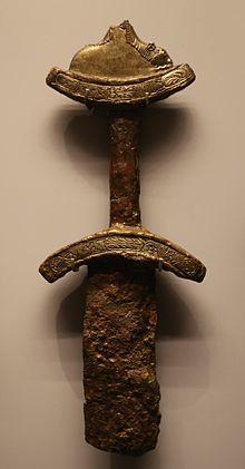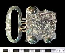 Burial finds from the fourth or early fifth century in Oxfordshire (prior to the Anglo-Saxon migration) have found evidence that military leaders of that time period wore belts that were elaborate, wide, and fastened by "a narrow strap which was riveted to the broad belt and passed through a buckle which was much narrower than the belt itself" leaving the end of the belt to hang down; attached to the belt were pouches which allowed soldiers to carry their weapons.[79]