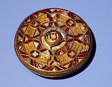 Brooches of the tenth and eleventh centuries are typically circular.[8] The most opulent brooches are silver, others are base metal. Small, round brooches, worn as cloak fasteners, are often depicted on men in late Anglo-Saxon art. Other brooch types which have been uncovered in late Anglo-Saxon burial finds are not seen in Anglo-Saxon art during this time period.[64]