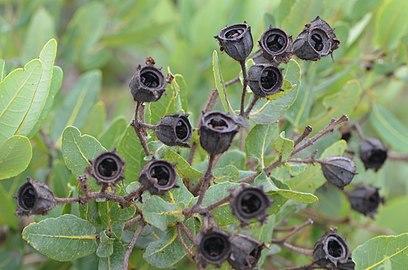 Angophora is a genus of nine species of trees and shrubs in the myrtle family, Myrtaceae and is endemic to eastern Australia. They differ from other eucalypts in having juvenile and adult leaves arranged in opposite pairs, sepals reduced to projections on the edge of the floral cup, four or five overlapping, more or less round petals, and a papery or thin, woody, often strongly ribbed capsule. Species are found between the Atherton Tableland in Queensland and south through New South Wales to eastern Victoria, Australia.