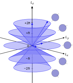 Since the angular momenta are quantum operators, they cannot be drawn as vectors like in classical mechanics. Nevertheless, it is common to depict them heuristically in this way. Depicted on the right is a set of states with quantum numbers , and for the five cones from bottom to top. Since , the vectors are all shown with length . The rings represent the fact that is known with certainty, but and are unknown; therefore every classical vector with the appropriate length and z-component is drawn, forming a cone. The expected value of the angular momentum for a given ensemble of systems in the quantum state characterized by and could be somewhere on this cone while it cannot be defined for a single system (since the components of do not commute with each other).