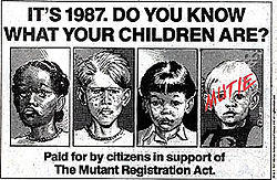 Marvel Comics used a novel approach in advertising the crossover event. A major element within the stories at the time was the public's growing concern over the "mutant menace" and Senator Robert Kelly's proposed Mutant Registration Act, which foreshadowed the dystopian future shown in "Days of Future Past". Marvel distributed postcard-size mock advertisements supporting the act in comic book stores as well as their various titles cover dated "November 1987". Asking "Do You Know What Your Children Are?", the card further suggested that anyone who knew themselves to be a mutant should fill out the form on the back and mail it in to register themselves with the government.