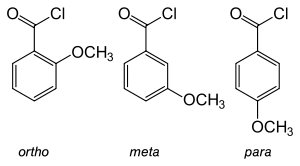 Anisoyl chloride (also called methoxybenzoyl chloride) is an acyl halide, specifically an aromatic acyl chloride, and may be formed from anisic acid by replacing a hydroxyl group of the carboxylic acid with a chloride group. There are three isomers: the ortho-, meta-, and para- forms. Their structures differ in the arene substitution pattern—the location of the methoxy group on the ring as compared to the acyl halide.