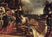 Ovid reports a legend that identifies Anna Perenna with the sister of Dido, the Carthaginian founder in Virgil's Aeneid.[4] After Dido's tragic death, Anna finds refuge from her brother Pygmalion on Malta, with Battus, the king of the island and a wealthy host.[4] Upon protecting Anna for three years, Battus counselled her to flee for her safety and find a fresh place of exile as her brother was seeking war. Forced again to flee over the seas, Anna Perenna was shipwrecked on the coasts of Latium where she was hosted by Aeneas' settlement of Lavinium. Anna's presence there made Lavinia increasingly jealous. Dido appeared in Anna's dream, exhorting her to abandon her latest refuge, from where she was swept away by the river Numicus and transformed into a river nymph hidden in the "perennial stream" (amnis perennis), and renamed Anna Perenna.[4]