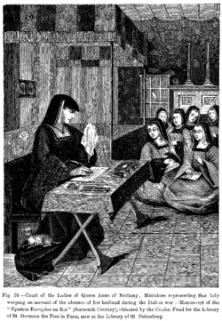 Anne was also a patron of the arts and enjoyed music. A prolific collector of tapestries, it is very likely that the unicorn tapestries now on view at The Cloisters museum in New York City were commissioned by her in celebration of her wedding to Louis XII.[6] Of her four surviving illuminated manuscript books of hours the most famous is the Grandes Heures of Anne of Brittany. She also patronized printed books and their authors.