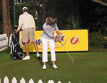 Sörenstam was invited to play in the PGA Tour's Bank of America Colonial golf tournament in Fort Worth, Texas, in May 2003, making her the first woman to play in a PGA Tour event since Babe Zaharias, who qualified for the 1945 Los Angeles Open.[53] Vijay Singh, fourth in the world rankings at the time, criticised her invitation, saying that she should have to qualify like the men and that he did not want to be beaten by a woman.[54][55] Cheered through each hole, she shot five over par, tying for 96th out of the 111 who finished the first two rounds. After shooting 1-over-par 71 in the first round, finishing in 73rd and on pace to challenge for a weekend spot, Sörenstam said she was nervous all day but pleased by her performance.[56] In the first round she led the field in driving accuracy, was in the top 20 in greens in regulation, and was 84th out of 111 in driving distance. Poor putting (last in the field, averaging over a two-putt) caused her to miss the cut.[57]
