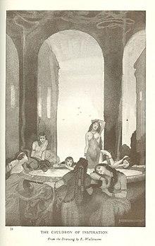 Preiddeu Annwfn, an early medieval poem found in the Book of Taliesin, describes a voyage led by King Arthur to the numerous otherworldy kingdoms within Annwn, either to rescue the prisoner Gweir or to retrieve the cauldron of the Head of Annwn. The narrator of the poem is possibly intended to be Taliesin himself. One line can be interpreted as implying that he received his gift of poetry or speech from a magic cauldron, as Taliesin does in other texts, and Taliesin's name is connected to a similar story in another work.[4] The speaker relates how he journeyed with Arthur and three boatloads of men into Annwfn, but only seven returned. Annwfn is apparently referred to by several names, including "Mound Fortress," "Four-Peaked Fortress," and "Glass Fortress", though it is possible the poet intended these to be distinct places. Within the Mound Fort's walls Gweir, one of the "Three Exalted Prisoners of Britain" known from the Welsh Triads,[5] is imprisoned in chains. The narrator then describes the cauldron of the Chief of Annwn: it is finished with pearl and will not boil a coward's food. Whatever tragedy ultimately killed all but seven of them is not clearly explained. The poem continues with an excoriation of "little men" and monks, who lack various forms of knowledge possessed by the poet.