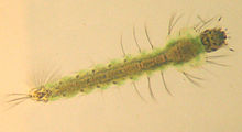 Larvae develop through four stages, or instars, after which they metamorphose into pupae. At the end of each instar, the larvae molt, shedding their exoskeletons, or skin, to allow for further growth.[9] First-stage larvae are about 1 mm in length; fourth-stage larvae are normally 5–8 mm in length.