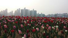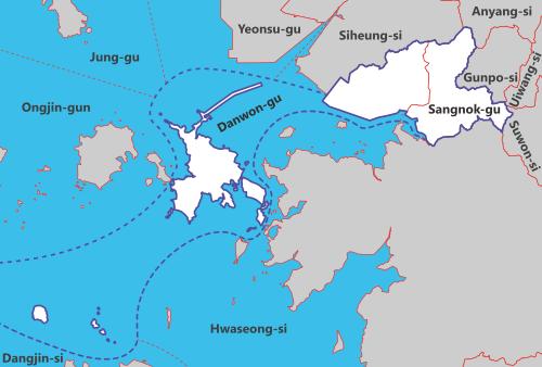 Located at the south of the city are Daebudo[15] and Pungdo.[16] Kwonsun, Gunpo, and Anyang are located in the east of Ansan. The Yellow Sea to the west, Hwaseong to the south, and Siheung to the north are other boundaries.