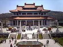 Of particular note is the Jade Buddha Palace. This large Buddhist temple complex of 22,104 square metres, houses the world's largest statue of Buddha made of Jade (It is called jade in Chinese, but in English it is Serpentine). It is a single piece of jade stone measuring 6.88 metres in width, 4.10 metres front to back and 7.95 metres high. The jade stone weighs 260.76 tons.[15] The front of the stone has been carved with an image of Sakyamuni (aka. Gautama) Buddha. On the back of the stone Guanyin (aka. Avalokitesvara) Buddha has been carved. The jade stone was found in 1960 in Xiuyan County. It was declared a treasure of the State and listed as a protected property by Chinese Premier Zhou Enlai. Anshan city government commissioned the carving which took a team of 120 sculptures 18 months to complete. The temple complex was opened on September 3, 1996. The building that houses the Jade Buddha statue is 33 metres tall, representing the 33 layers of heaven in Buddhism. It claims to be one of the tallest two-story buildings of traditional Chinese architectural style in China.