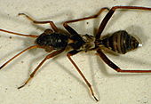 Four species of arthropod mimic the ant Camponotus planatus within the Mountain Pine Ridge Forest Reserve of British Honduras.[30] This is both Batesian and Wassmanian mimicry.[30] The first mimic is the clubnoid spider (Myrmecotypus fuliginosus) which mimics C. planatus in various ways including morphology and behaviour. Secondly, the salticid spider Sarindia linda mimics C. planatus so well that they are hard to distinguish. S. linda mimics the locomotion patterns, pumping of the abdomen, and movements of the antennae.[30] The third mimic is a Mirid bug (Barberiella) which mimics the model in both gait and antennal mimicry. Finally, the mantid, Mantoida maya also uses C. planatus as a model.[30] Individuals that mimic C. planatus are typically 3-9mm long and predators tend to avoid them. All four mimics have been seen foraging in areas with their model with no interference.[25]