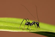 Young instars of some Orthoptera, such as the bush cricket Macroxiphus sumatranus, have an "uncanny resemblance" to ants, extending to their black coloration, remarkably perfect antlike shape, and convincingly antlike behaviour.[4] Their long antennae are camouflaged to appear short, being black only at the base, and they are vibrated like ant antennae. Larger instars suddenly change into typical-looking katydids, and are entirely nocturnal, while the adult has bright warning coloration.[4]