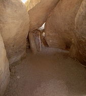 Consists of an irregular free-standing plan, composed of a single-chamber, articulated horizontal body with polygonal chamber and rectangular corridor.[2][1] The funerary chamber and access corridor are covered by size-specific slabs of rock: large granite slabs over the funerary chamber and smaller rock slabs on the entrance corridor.[2][1]