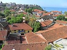 Despite having architectural heritage dating back up to Hellenistic times, most historical architecture in Antalya date to the medieval Seljuk period, with a number of mosques, madrasahs, masjids, caravanserais, Turkish baths and tombs giving the city a Turkish-Islamic character.[38][39] Historical architecture is concentrated in the walled city, Kaleiçi; ancient structures are not well-preserved in the rest of the city of Antalya as the modern city was built on the ancient city.[40] Kaleiçi, with its narrow cobbled streets of historic Ottoman era houses, is the old center of Antalya. With its hotels, bars, clubs, restaurants, and shopping, it has been restored to retain much of its historical character.[40][41] It is surrounded by two walls in the shape of a horsenail, one of which is along the seafront, built in a continuous process from Hellenistic to Ottoman times. The historical harbour is located in this part of the city; narrow streets extend from the harbour and branch off into the old city, surrounded by wooden historical houses.[39] Cumhuriyet Square, the main square of the city and a spot very popular for tourists and locals, is surrounded by shopping and business centres and public buildings.[42] There are sites with traces of Hellenistic, Roman, Byzantine, and Seljuk architecture and cultures.[40] There are also examples of the local Greek architecture in the city, with five Greek Orthodox churches in the old city.[43]
