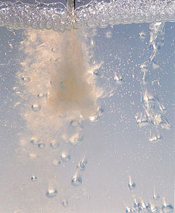 Generally a defoamer is insoluble in the foaming medium and has surface active properties. An essential feature of a defoamer product is a low viscosity and a facility to spread rapidly on foamy surfaces. It has affinity to the air-liquid surface where it destabilizes the foam lamellas. This causes rupture of the air bubbles and breakdown of surface foam. Entrained air bubbles are agglomerated, and the larger bubbles rise to the surface of the bulk liquid more quickly.[2]