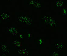 There are many nuclear staining patterns seen on HEp-2 cells: homogeneous, speckled, nucleolar, nuclear membranous, centromeric, nuclear dot and pleomorphic. The homogeneous pattern is seen when the condensed chromosomes and interphase chromatin stain. This pattern is associated with anti-dsDNA antibodies, antibodies to nucleosomal components, and anti-histone antibodies. There are two speckled patterns: fine and coarse. The fine speckled pattern has fine nuclear staining with unstained metaphase chromatin, which is associated with anti-Ro and anti-La antibodies. The coarse staining pattern has coarse granular nuclear staining, caused by anti-U1-RNP and anti-Sm antibodies. The nucleolar staining pattern is associated with many antibodies including anti-Scl-70, anti-PM-Scl, anti-fibrillarin and anti-Th/To. Nuclear membrane staining appears as a fluorescent ring around the cell nucleus and are produced by anti-gp210 and anti-p62 antibodies. The centromere pattern shows multiple nuclear dots in interphase and mitotic cells, corresponding to the number of chromosomes in the cell. Nuclear dot patterns show between 13 and 25 nuclear dots in interphase cells and are produced by anti-sp100 antibodies. Pleomorphic pattern is caused by antibodies to the proliferating cell nuclear antigen.[25][52][56][57] Indirect immunofluorescence has been shown to be slightly superior compared to ELISA in detection of ANA from HEp-2 cells.[53]