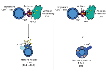 T cells must be activated before they can divide and perform their function. This is achieved by interacting with a professional APC which presents an antigen recognized by their T cell receptor. The APC involved in activating T cells is usually a dendritic cell. T cells cannot recognize (and therefore cannot respond to) "free" or soluble antigens. They can only recognize and respond to antigen that has been processed and presented by cells via carrier molecules like MHC molecules. Helper T cells can recognize exogenous antigen presented on MHC class II; cytotoxic T cells can recognize endogenous antigen presented on MHC class I. Most cells in the body can present antigen to CD8+ cytotoxic T cells via MHC class I; however, the term "antigen-presenting cell" is often used specifically to describe professional APCs. Such cells express MHC class I and MHC class II molecules and can stimulate CD4+ helper T cells as well as cytotoxic T cells.[2][3]