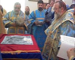 At the Divine Liturgy, during the Ektenias (Litanies) that precede the Great Entrance, the eileton is opened fully and the antimins is opened two-thirds of the way, leaving the top portion folded. Then, during the Ektenia of the Catechumens, when the deacon says, "That He (God) may reveal unto them (the catechumens) the Gospel of righteousness," the priest unfolds the last portion of the antimins, revealing the mystery of Christ's death and resurrection. After the Entrance, the chalice and diskos are placed on the antimins and the Gifts (bread and wine) are consecrated. The antimins remains unfolded until after all have received Holy Communion and the chalice and diskos are taken back to the Prothesis (Table of Oblation). The deacon (or, if there is no deacon, the priest) must very carefully inspect the antimins to be sure there are no crumbs left on it, and then it is folded up, the eileton is folded, and the Gospel Book placed on top of it.