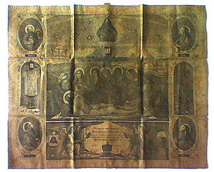 The Antimins (from the Greek Ἀντιμήνσιον, Antimension: "instead of the table"), is one of the most important furnishings of the altar in many Eastern Christian liturgical traditions. It is a rectangular piece of cloth of either linen or silk, typically decorated with representations of the Descent of Christ from the Cross, the Four Evangelists, and inscriptions related to the Passion. A small relic of a martyr is sewn into it.