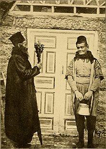 The designation "Greek" mostly refers to the use of Koine Greek in liturgy,[20] and most Antiochian Greek Christians therefore identify themselves as native to the region.[21][22][23] However, they were included as Greeks in an ethnographic study published by French historian and ethnographer Alexander Synvet in 1878.[24] According to Greek historian Pavlos Karolidis writing in 1908, they are a mixture of ancient Greek settlers and particularly Macedonians, Roman-era Greeks, and Byzantine Greeks ("Rûm"), as well as indigenous Levantines.[25] Karolidis was attempting to refute the Russian claims that they were of Aramaic origin.[26] During the First Crusade era, most of them were referred to as Syriacs ethnically and Greeks only in regard to religious affinity: only the inhabitants of Antioch city were thought to be Greek ethnically.[27]