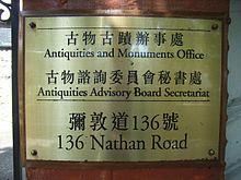 The Antiquities and Monuments Office (AMO) was established in 1976 under the Antiquities and Monuments Ordinance to protect and preserve Hong Kong's historic monuments. Housed in the Former Kowloon British School, the AMO is responsible for identifying, recording and researching buildings and items of historical interest, as well as organising and coordinating surveys and excavations in areas of archaeological significance.[1] The Leisure and Cultural Services Department of the Hong Kong government currently manages the Office.