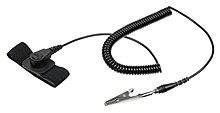 An antistatic wrist strap, ESD wrist strap, or ground bracelet is an antistatic device used to safely ground a person working on very sensitive electronic equipment, to prevent the buildup of static electricity on their body, which can result in ESD. It is used in the electronics industry when handling electronic devices which can be damaged by ESD, and also sometimes by people working around explosives, to prevent electric sparks which could set off an explosion. It consists of an elastic band of fabric with fine conductive fibers woven into it, attached to a wire with a clip on the end to connect it to a ground conductor. The fibers are usually made of carbon or carbon-filled rubber, and the strap is bound with a stainless steel clasp or plate. They are usually used in conjunction with an antistatic mat on the workbench, or a special static-dissipating plastic laminate on the workbench surface.