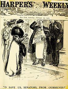 Anti-suffragists, such as Josephine Dodge, argued that giving women the right to vote would overburden them and undermine their privileged status.[54] They saw participation in the private sphere as essential to a woman's role and thought that giving them public duties would prevent them from fulfilling their primary responsibilities in the home. Anti-suffragists claimed that they represented the "silent majority" of America who did not want to enter the public sphere by gaining the right to vote.[73] Being against women's suffrage didn't mean, however, that all Antis were against civic pursuits.[74] Jeanette L. Gilder, a journalist, wrote "Give women everything she wants, but not the ballot. Open every field of learning, every avenue of industry to her, but keep her out of politics."[75] Dodge encouraged women to become involved in "charitable, philanthropic and educational activities."[74] It was also cited that women had made reforms such as raising the age of consent without the vote and that gaining this right was, therefore, unnecessary and could even be harmful to further reform movements.[76] The thought was that women were able to influence the government because they were seen as politically neutral and non-partisan and giving them the right to vote would strip them of this unique position.[77] In addition, because voting is "only a small part of government," they believed there was no need to vote in order to participate in politics.[72] This particular line of reasoning, that women should stay out of politics, kept the General Federation of Women's Clubs (GFWC) from officially endorsing suffrage until 1914.[78]