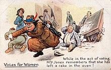 Organized campaigns against women's suffrage began in earnest in 1905, around the same time that suffragettes were turning to militant tactics.[11] In general, most ordinary women had prioritized domestic and family life over paid employment and political activism when it came to the issue of suffrage.[12] Most historical evidence shows that ordinary women did not have much interest in the right to vote before the first World War and also after suffrage had been granted to women.[13]