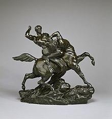 Barye, though engaged in a perpetual struggle with want, exhibited year after year studies of animals, admirable groups which reveal him as inspired by a spirit of true romance and a feeling for the beauty of the antique, as in his Theseus and the Minotaur (1843),[6] Roger and Angelica on the Hippogriff (1846)), Lapitha and Centaur (1848), Jaguar Devouring a Hare (1850), and numerous minor works now very highly valued.[1] The latter two works were exhibited at the Paris Salon of 1850, causing Théophile Gautier to observe:"The mere reproduction of nature does not constitute art; Barye aggrandizes his animal subjects, simplifying them, idealizing and stylizing them in a manner that is bold, energetic, and rugged, that makes him the Michelangelo of the menagerie."