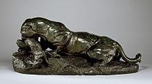 Barye didn't only want to be known as a sculptor of small bronzes, he wanted to be known as a sculpteur statuaire (a sculptor of large statues). In 1831 he exhibited much larger statues, Tiger Devouring a Gavial Crocodile,[4] which was a plaster sculpture 41 cm high and 103 cm long, and Lion Crushing a Serpent, 138 cm high and 178 cm long, made in bronze.[5] In 1832 had truly mastered a style of his own in the Lion with a Snake.