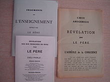 The Antoinist literature is mainly composed of Antoine's writings, which are considered as sacred by followers and should not be modified.[159] They include three doctrinal books grouped into two volumes which are sold in the temples and read during the worship: Revelation of the Father (La Révélation par le Père), The Coronation of the Revealed Work (Le Couronnement de l'Œuvre révélée) and Development of the Teaching of Father (Le Développement de l'Enseignement du Père). According to Debouxhtay, "the writings of Antoine do not shine by their qualities of style", a view shared by other observers.[160] Many statements from the Antoines are gathered into 14 books called Tomes, which remain only accessible to dressed members. From May 1907 to April 1909, the religion published the journal The Halo of Consciousness,[58] then from September 1911 to August 1914, The Unitive.[161] In 1936, Belgian writer Robert Vivier published a hagiographic biography—although based on real facts—of Louis Antoine, which is also used by Antoinists to strengthen their faith,[162][163] and thus sold in the temples.[164]