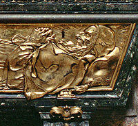 The front of his tomb has a lid of gilded bronze which shows a likeness of the dead pope. Most of the time this is left open to allow the veneration of the saint's remains.