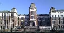 - Palace of Justice, designed by the Richard Rogers Partnership, Arup and VK Studio, and opened by King Albert II, in April 2006.[37][38] This building is the antithesis of the heavy, dark court building, designed by Joseph Poelaert, which dominates the skyline of Brussels. The courtrooms sit on top of six fingers that radiate from an airy central hall, and are surmounted by spires, which provide north light and resemble oast houses or the sails of barges on the nearby River Scheldt. It is built on the site of the old Zuid ("South") station, at the end of a magnificent 1.5 kilometres (1 mile) perspective at the southern end of Amerikalei. The road neatly disappears into an underpass under oval Bolivarplaats to join the motorway ring. This leaves peaceful surface access by foot, bicycle or tram (route 12). The building's highest 'sail' is 51 m (167 ft) high, has a floor area of 77,000 m2 (830,000 sq ft), and cost €130 million.