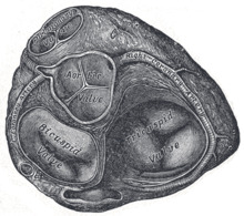 The aortic valve is semilunar (half-moon shaped) with three cusps. It separates the heart from the aorta. Each cusp is attached to the aortic wall creating a sinus; a Valsalva sinus. The origins of the two coronary arteries are sited in two Valsalva sinuses, each named after the coronary artery they supply. Leaflets are separated by commissures. The posterior leaflet is in continuation with the anterior leaflet of the mitral valve (the tissue is called the aorto-mitral curtain).[4] The aortic valve is opened during systole, the driving force for it to open is the difference in pressure between the contracting left ventricle of the heart and the aorta. During cardiac diastole (when the heart chamber gets bigger) the aortic valve closes.[5]