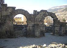 The east and south gates exist intact. The latter, a double gate with three arches flanked by two towers known as the Porta Praetoria (1st century AD) was the eastern gate to the city, and has preserved its original forms apart from the marble covering.[11] It is formed by two series of arches enclosing a small square.