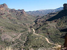 The Trail winds steeply through 40 miles (64 km) of rugged desert mountains, past deep reservoir lakes like Canyon Lake and Apache Lake. The narrow, winding road is unpaved from just east of the town of Tortilla Flat to Roosevelt Dam; there are steep cliff drops and few safety barriers. The trail requires caution when driving and it is not recommended for large RVs, SUVs, or caravans. Some large RV rental companies in the US do not allow their vehicles to be taken on this route.