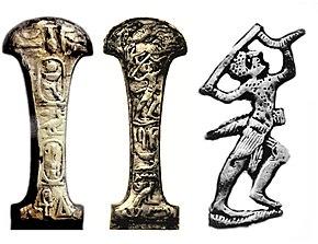 There is some discussion in Egyptology concerning whether Apepi also ruled Upper Egypt. There are indeed several objects with the king's name most likely coming from Thebes and Upper Egypt. These include a dagger with the name of the king bought on the art market in Luxor. There is an axe of unknown provenance where the king is called beloved of Sobek, lord of Sumenu. Sumenu is nowadays identified with Mahamid Qibli, about 24 kilometers south of Thebes and there is a fragment of a stone vessel found in a Theban tomb. For all these objects it is arguable that they were traded to Upper Egypt.[19] More problematic is a block with the king's name found at Gebelein. The block had been taken as evidence for building activity of the king in Upper Egypt and, hence, seen as proof that the Hyksos also ruled in Upper Egypt. However, the block is not very big and many scholars argue today, that it might have reached Gebelein after the looting of the Hyksos capital and is no proof of a Hyksos reign in Upper Egypt.[20]