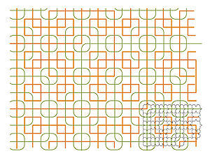 Only a few different kinds of constructions have been found. Notably, Jarkko Kari gave an aperiodic set of Wang tiles based on multiplications by 2 or 2/3 of real numbers encoded by lines of tiles (the encoding is related to Sturmian sequences made as the differences of consecutive elements of Beatty sequences), with the aperiodicity mainly relying on the fact that 2n/3m is never equal to 1 for any positive integers n and m.[23] This method was later adapted by Goodman-Strauss to give a strongly aperiodic set of tiles in the hyperbolic plane.[24] Shahar Mozes has found many alternative constructions of aperiodic sets of tiles, some in more exotic settings; for example in semi-simple Lie Groups.[25] Block and Weinberger used homological methods to construct aperiodic sets of tiles for all non-amenable manifolds.[26] Joshua Socolar also gave another way to enforce aperiodicity, in terms of alternating condition.[27] This generally leads to much smaller tile sets than the one derived from substitutions.