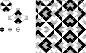 The first specific occurrence of aperiodic tilings arose in 1961, when logician Hao Wang tried to determine whether the Domino Problem is decidable — that is, whether there exists an algorithm for deciding if a given finite set of prototiles admits a tiling of the plane. Wang found algorithms to enumerate the tilesets that cannot tile the plane, and the tilesets that tile it periodically; by this he showed that such a decision algorithm exists if every finite set of prototiles that admits a tiling of the plane also admits a periodic tiling. In 1964 Robert Berger found an aperiodic set of prototiles from which he demonstrated that the tiling problem is in fact not decidable.[6][7] This first such set, used by Berger in his proof of undecidability, required 20,426 Wang tiles. Berger later reduced his set to 104, and Hans Läuchli subsequently found an aperiodic set requiring only 40 Wang tiles.[8] An even smaller set of six aperiodic tiles (based on Wang tiles) was discovered by Raphael M. Robinson in 1971.[9] Roger Penrose discovered three more sets in 1973 and 1974, reducing the number of tiles needed to two, and Robert Ammann discovered several new sets in 1977.[8]