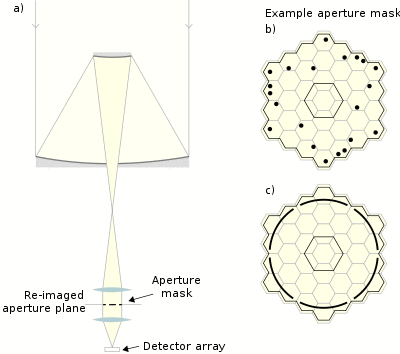 Each pair of holes provides a set of fringes at a unique spatial frequency in the image plane. Partially redundant masks are usually designed to provide a compromise between minimizing the redundancy of spacings and maximizing both the throughput and the range of spatial frequencies investigated (Haniff & Buscher, 1992; Haniff et al., 1989). Figures 1.b) and 1.c) show examples of aperture masks used in front of the secondary at the Keck telescope by Peter Tuthill and collaborators; Figure 1.b) is a non-redundant mask while Figure 1.c) is partially redundant.