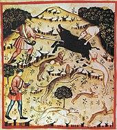 Humans hunted with wolves and in turn with domestic dogs for some 40,000 years; this collaboration may have helped modern humans to outcompete the Neanderthals.[35][36] Humans still hunt with dogs, which have often been bred as gun dogs to point to, flush out, or retrieve prey.[37] The Portuguese Water Dog was used to drive fish into nets.[38] Several breeds of dog have been used to chase large prey such as deer and wolves.[39]