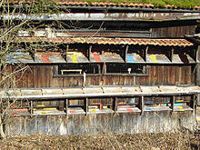 Apiary size refers not only to the spatial size of the apiary, but also to the number of bee families and bees by weight.[10] With ample space there is no limit to the number of hives or bee families which can be housed in an apiary. The larger the number of hives held in an apiary the higher the yield of honey relative to resources, often resulting in apiaries growing with time and experience.[10] Additionally a higher number of hives within an apiary can increase the quality of the honey produced.[10] Depending on the nectar and pollen sources in a given area, the maximum number of hives that can be placed in one apiary can vary. If too many hives are placed into an apiary, the hives compete with each other for scarce resources. This can lead to lower honey, flower pollen and bee bread yields, as well as higher transmission of disease and robbing.[11]