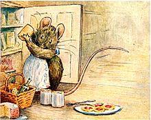 The book opens with a three-stanza rhyme about Appley Dapply, a mouse who raids cupboards for treats, and is accompanied with three illustrations, one which depicts a little mouse running away from a cupboard with a tray of pies:
