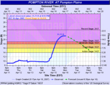 While areas closer to the shore received heavy rainfall, higher regions inland received unseasonal snow.[4] Several towns suffered from flooding including Mamaroneck in New York, and Bound Brook and Manville in New Jersey, while coastal towns had to deal with damage from high tides. Most major highways in Westchester County, New York were closed on April 15 and April 16 due to extreme flooding. In Quebec, several regions including the Laurentides and Charlevoix regions received in excess of 6 inches (15 cm) of snow with areas exceeding well above 1 foot (30 cm) of snow. In the city of Ottawa, 17 cm (5 in) of heavy wet snow fell in just a few hours causing power lines and trees to fall down causing scattered blackouts in several parts of the city.[5] Similar damage was reported in the higher elevations north of Montreal and Ottawa.